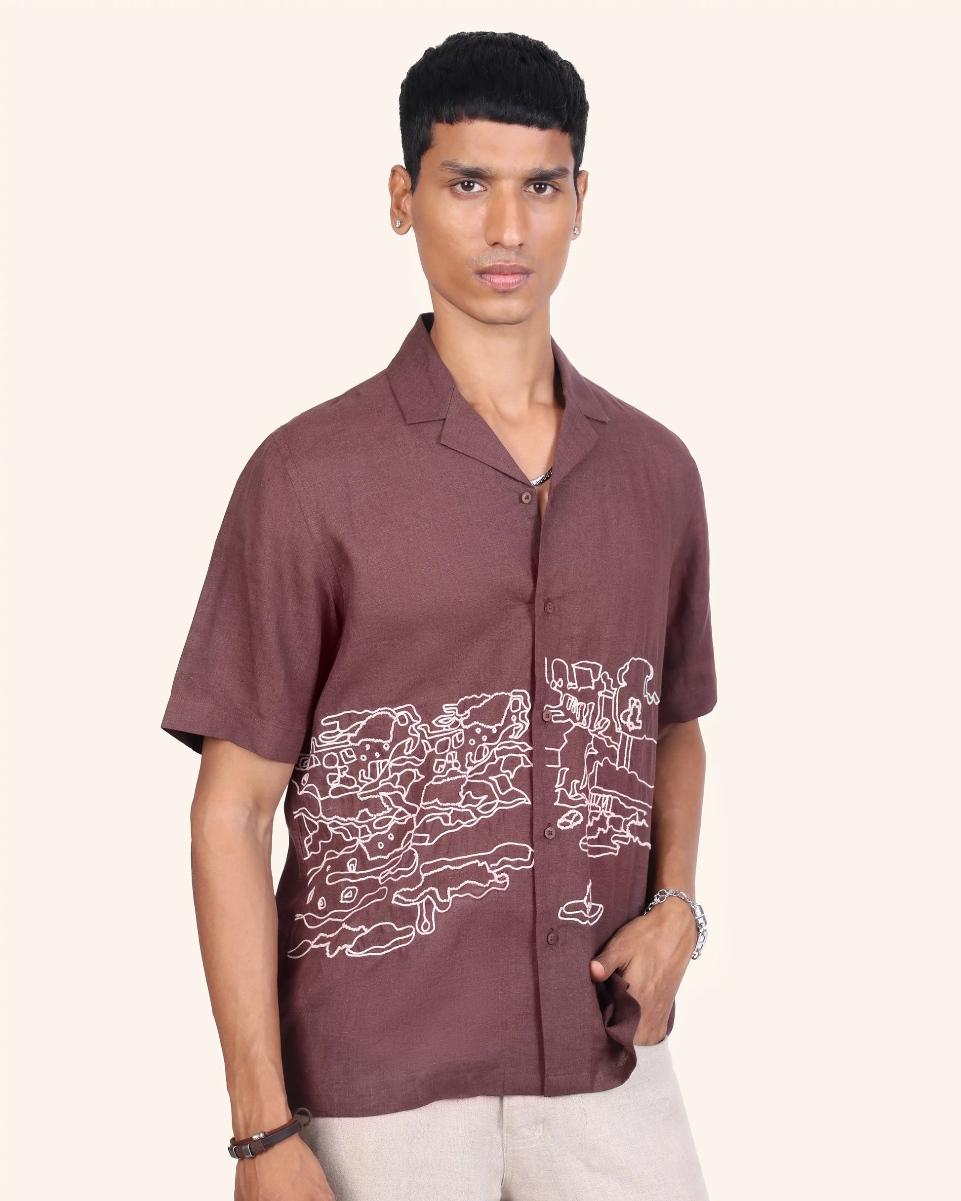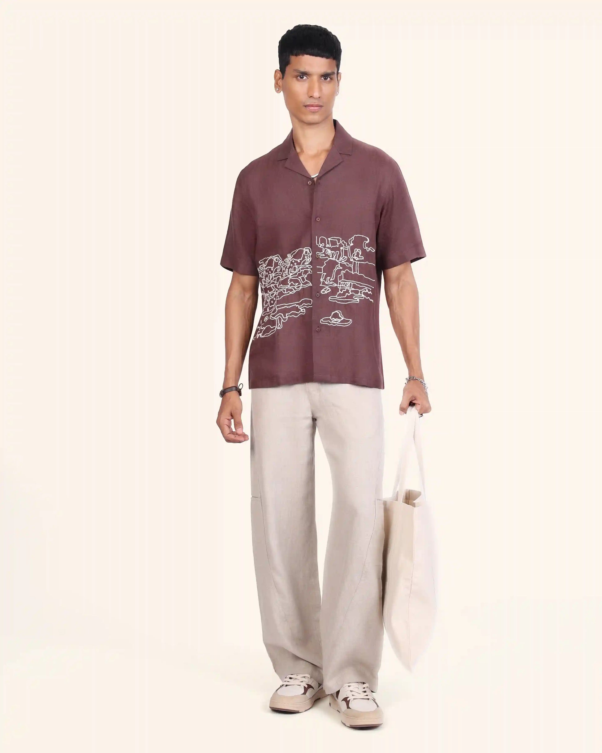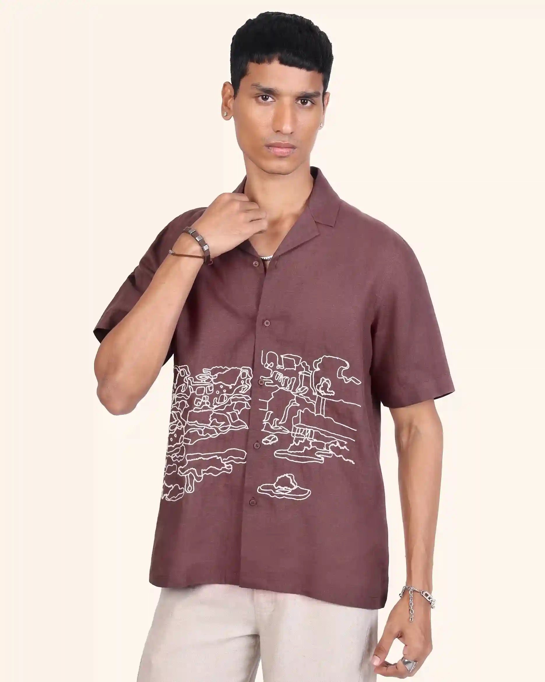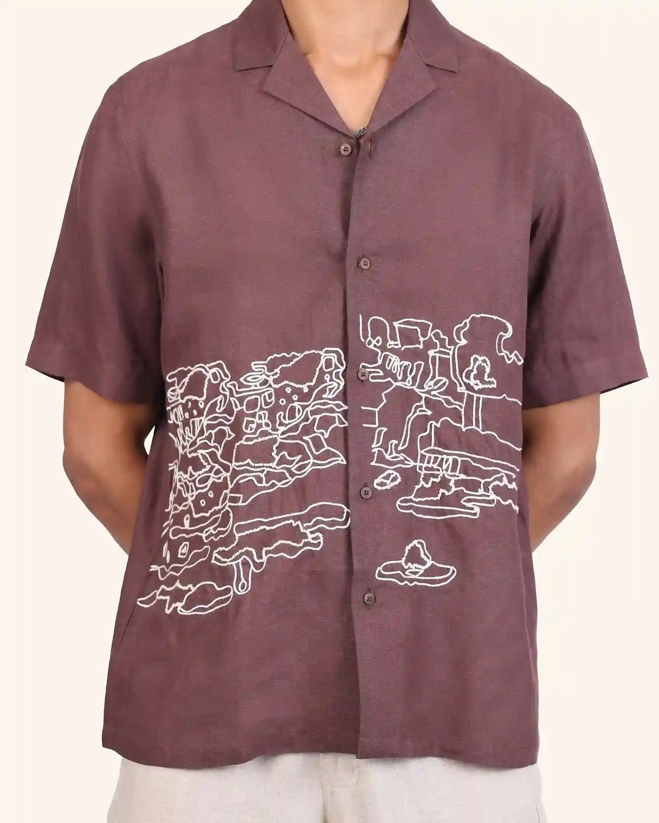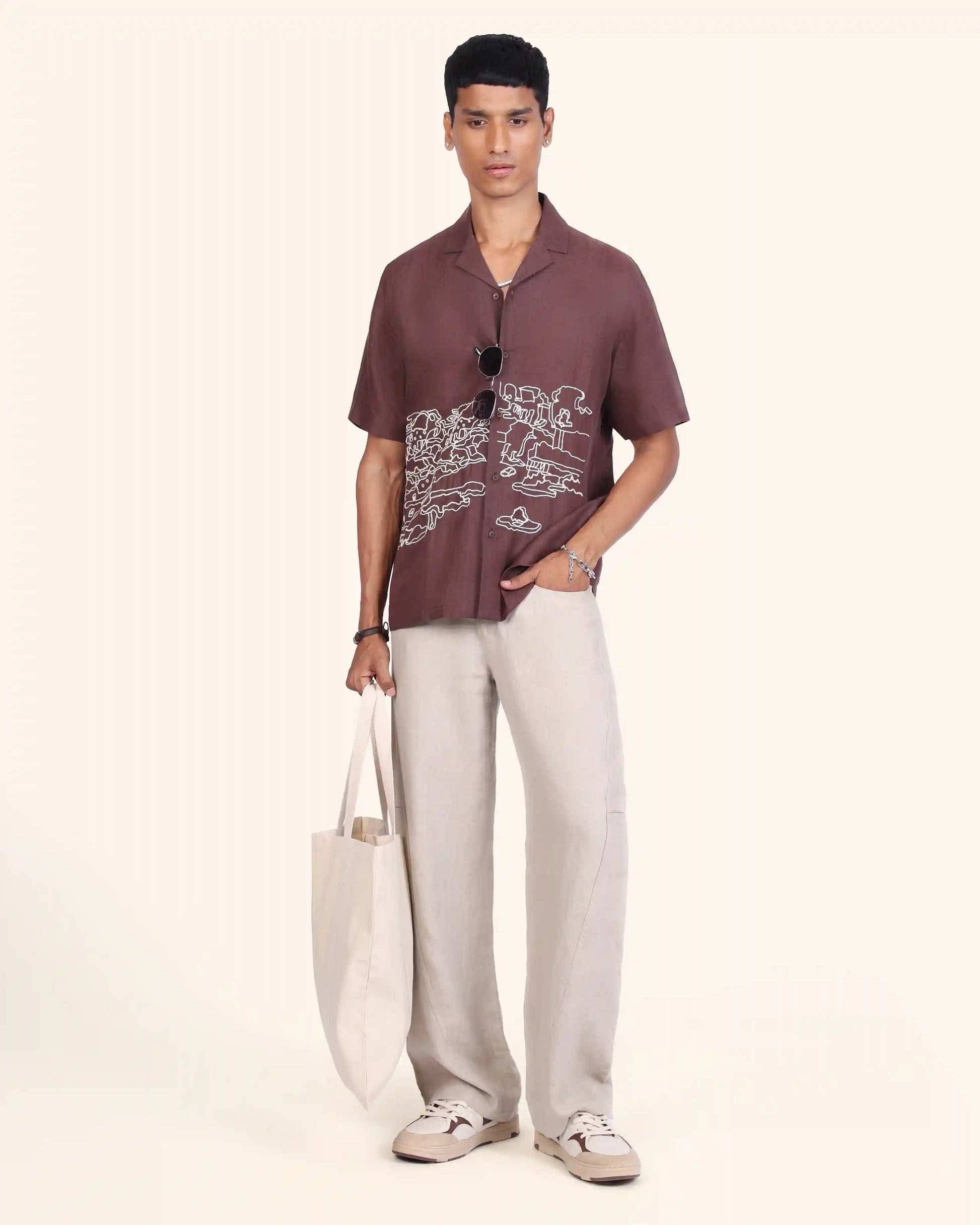 Soft brown linen meets freehand embroidery, inspired by landscapes and slow days. The open collar and easy fit make it perfect for laid-back plans. Made to order in 100% pure linen, it’s an everyday essential with a crafted touch.