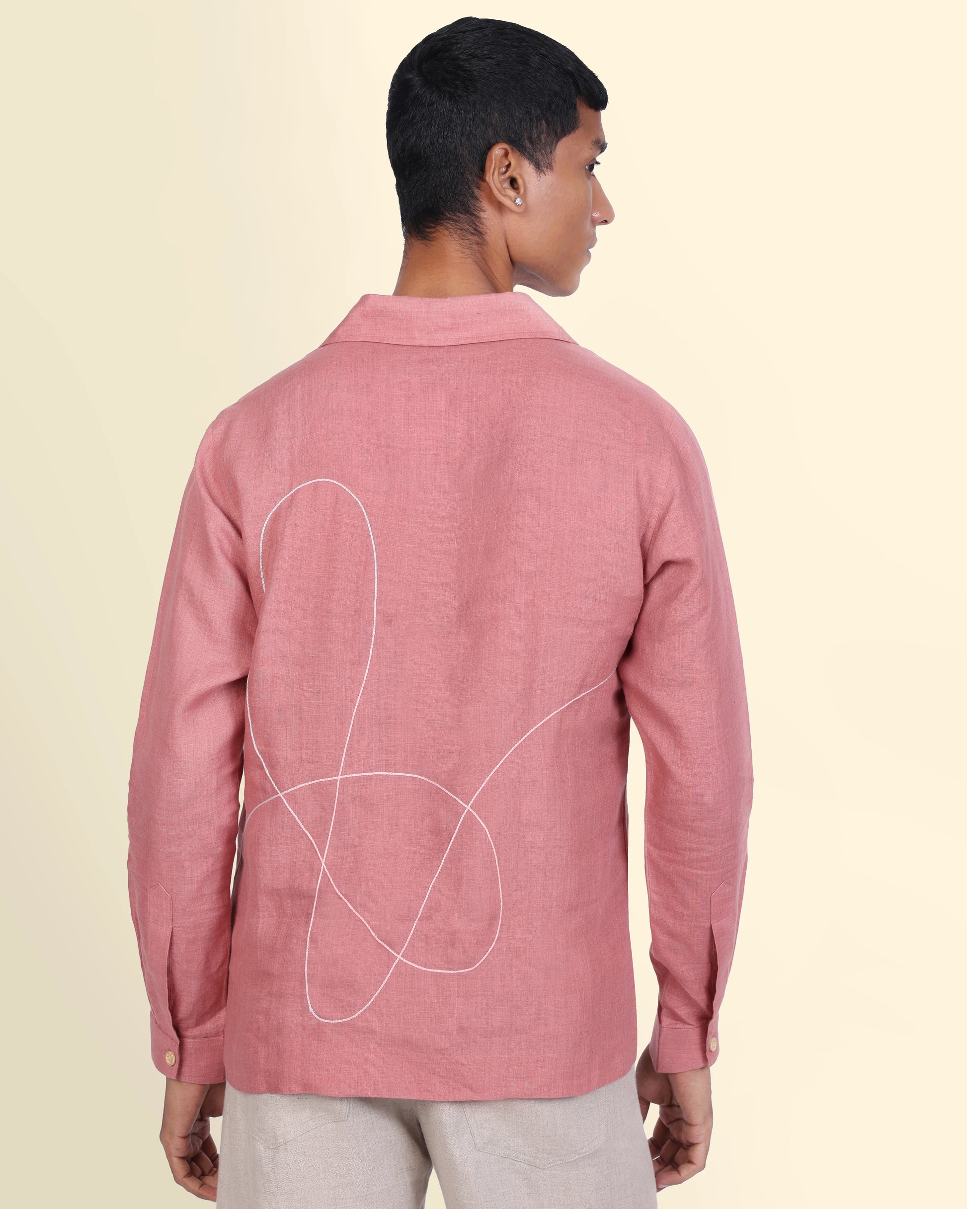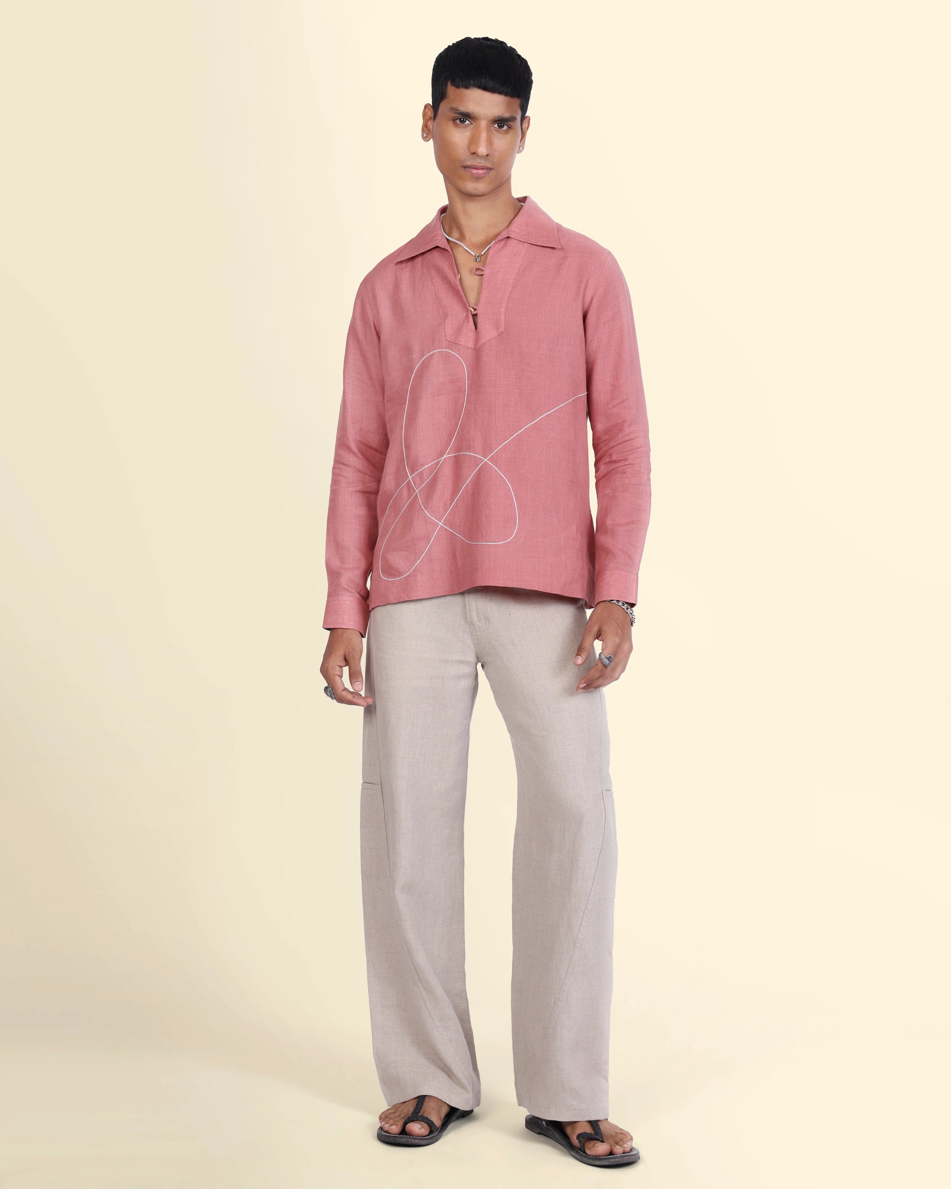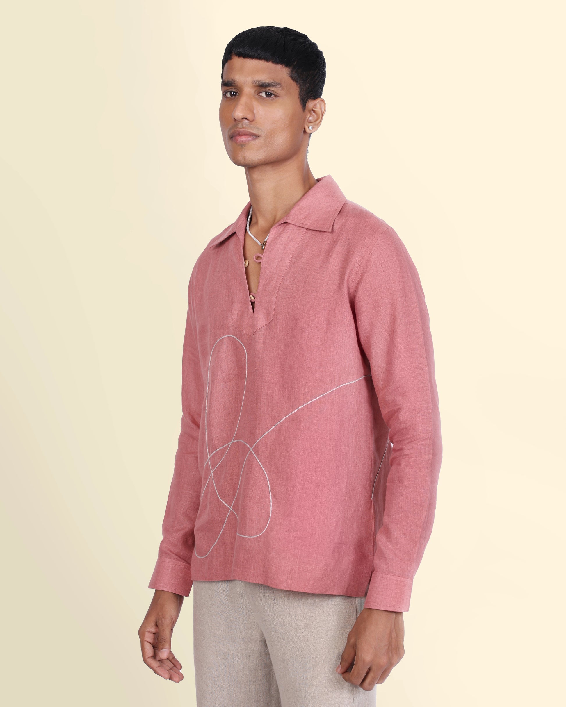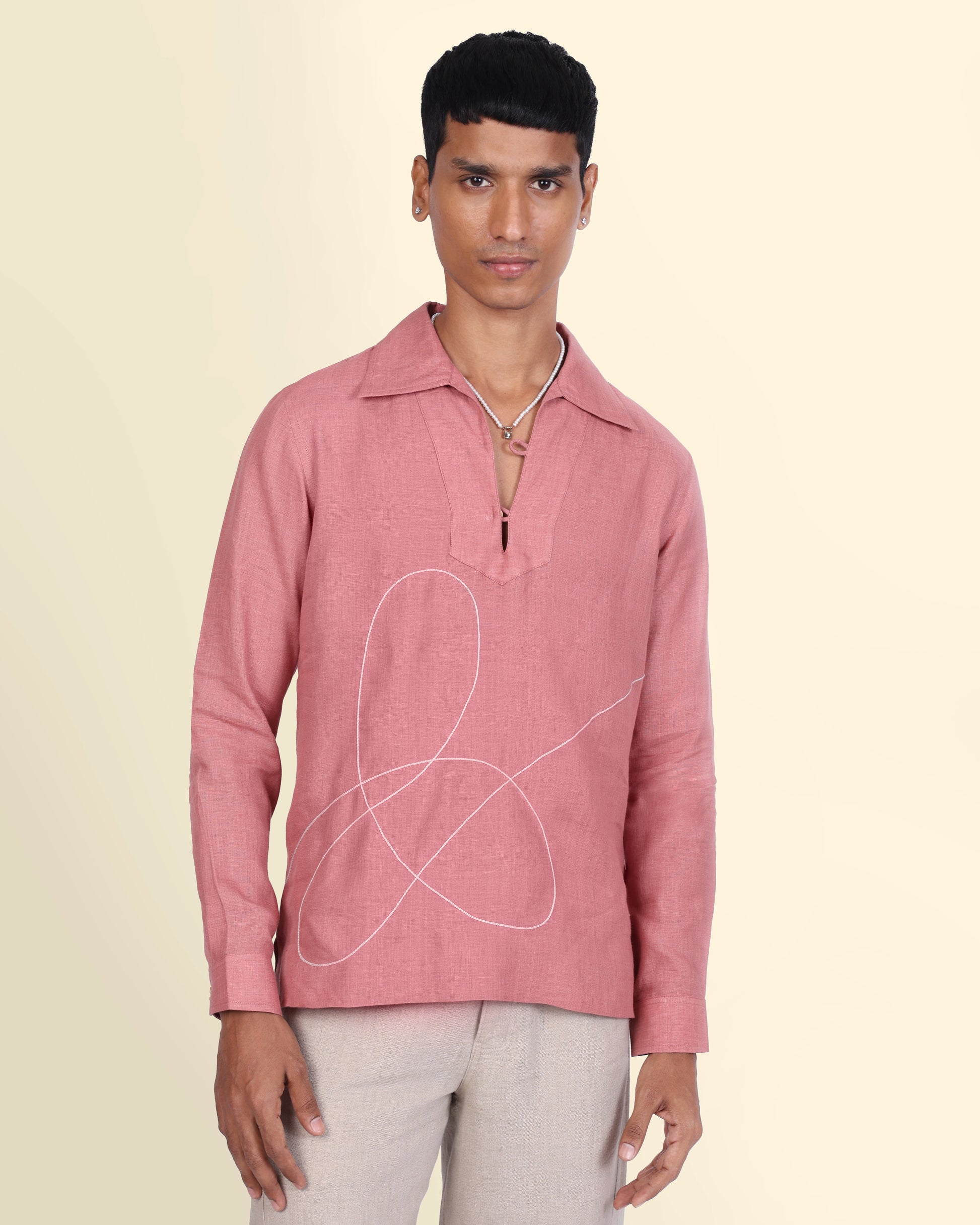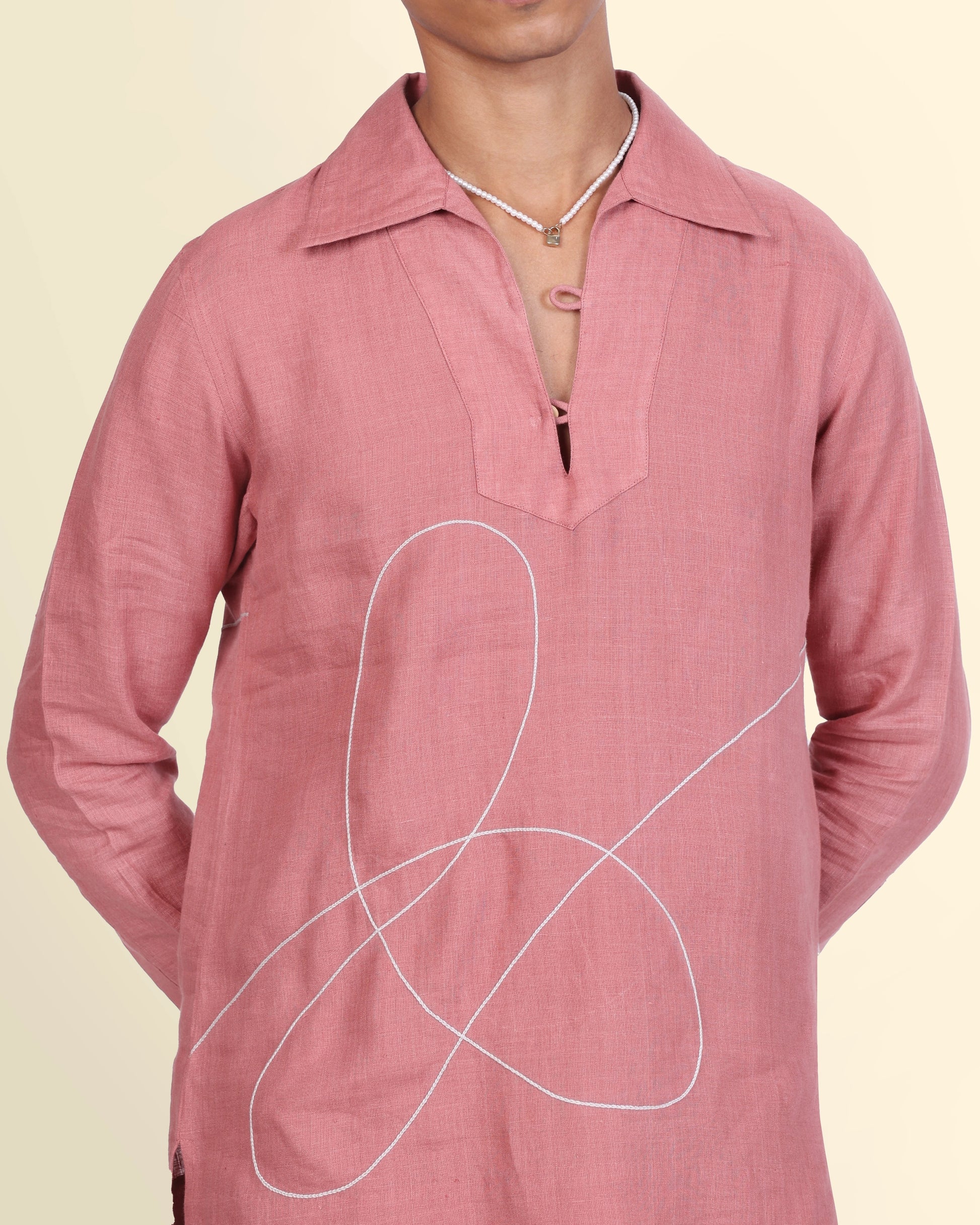 Delicate white threads dance across soft rose pink fabric, turning tradition into effortless ease. This hand-embroidered kurta is crafted in 100% pure linen, is lightweight, breathable, and made to order. A festive piece that’s soft-spoken yet striking, perfect for celebrations that call for quiet elegance.