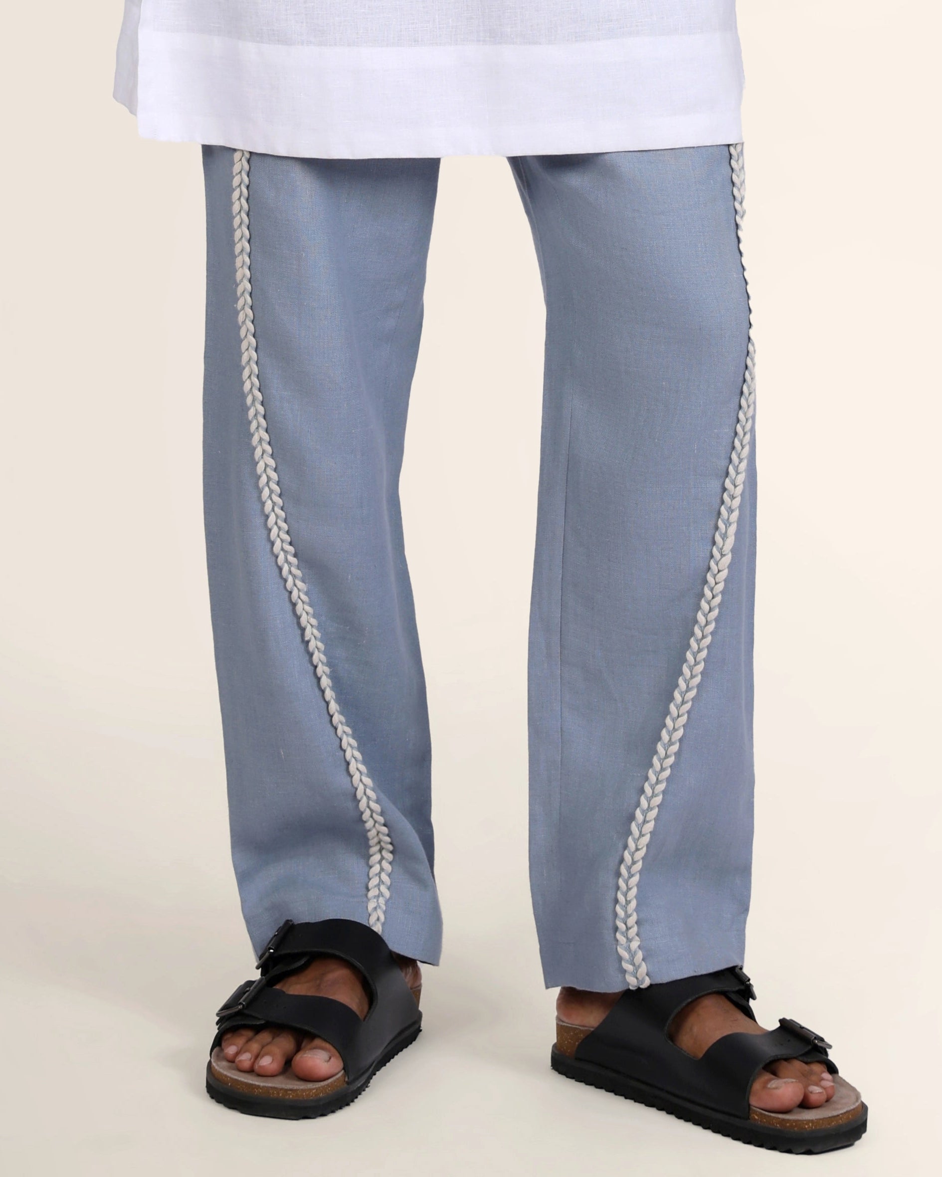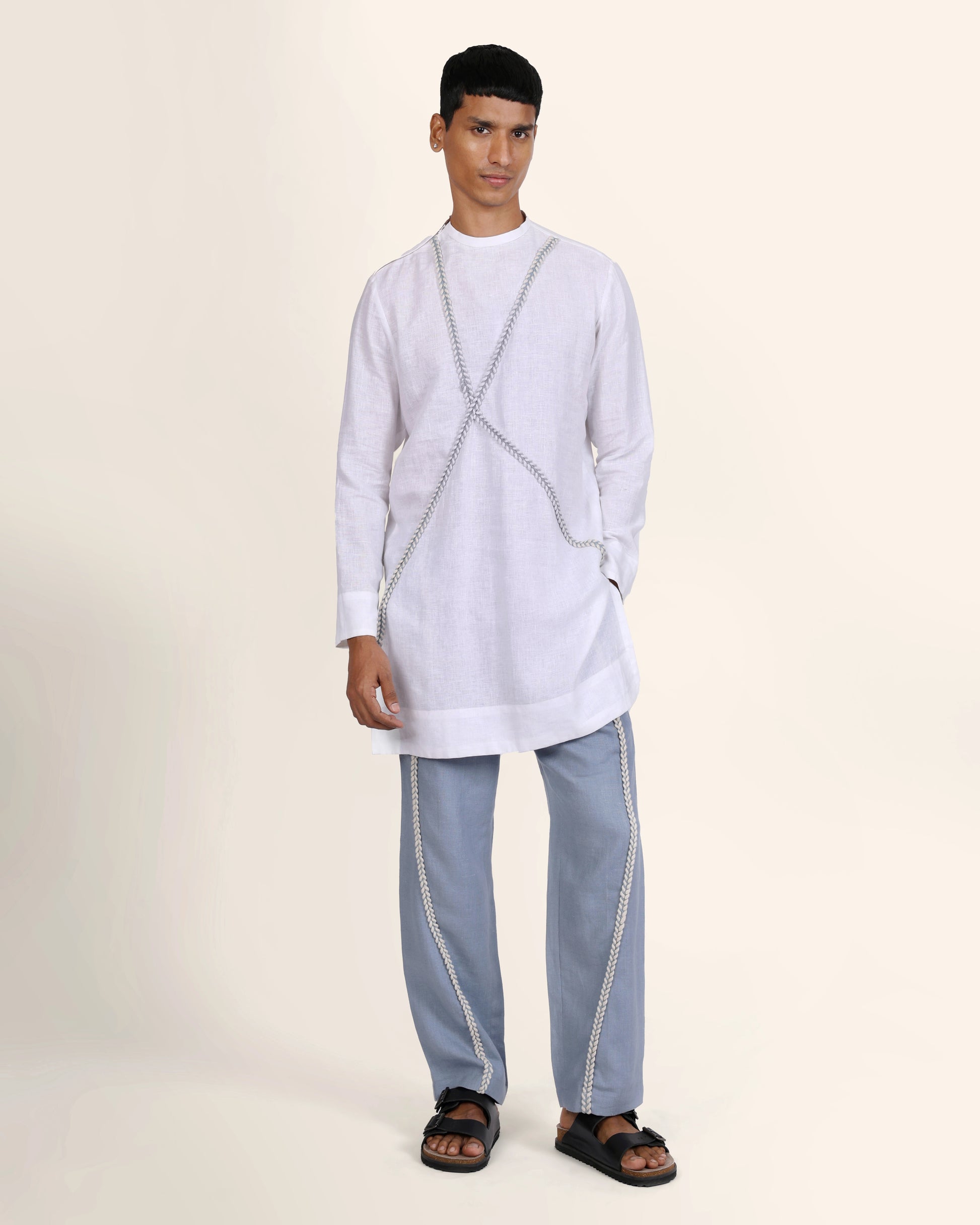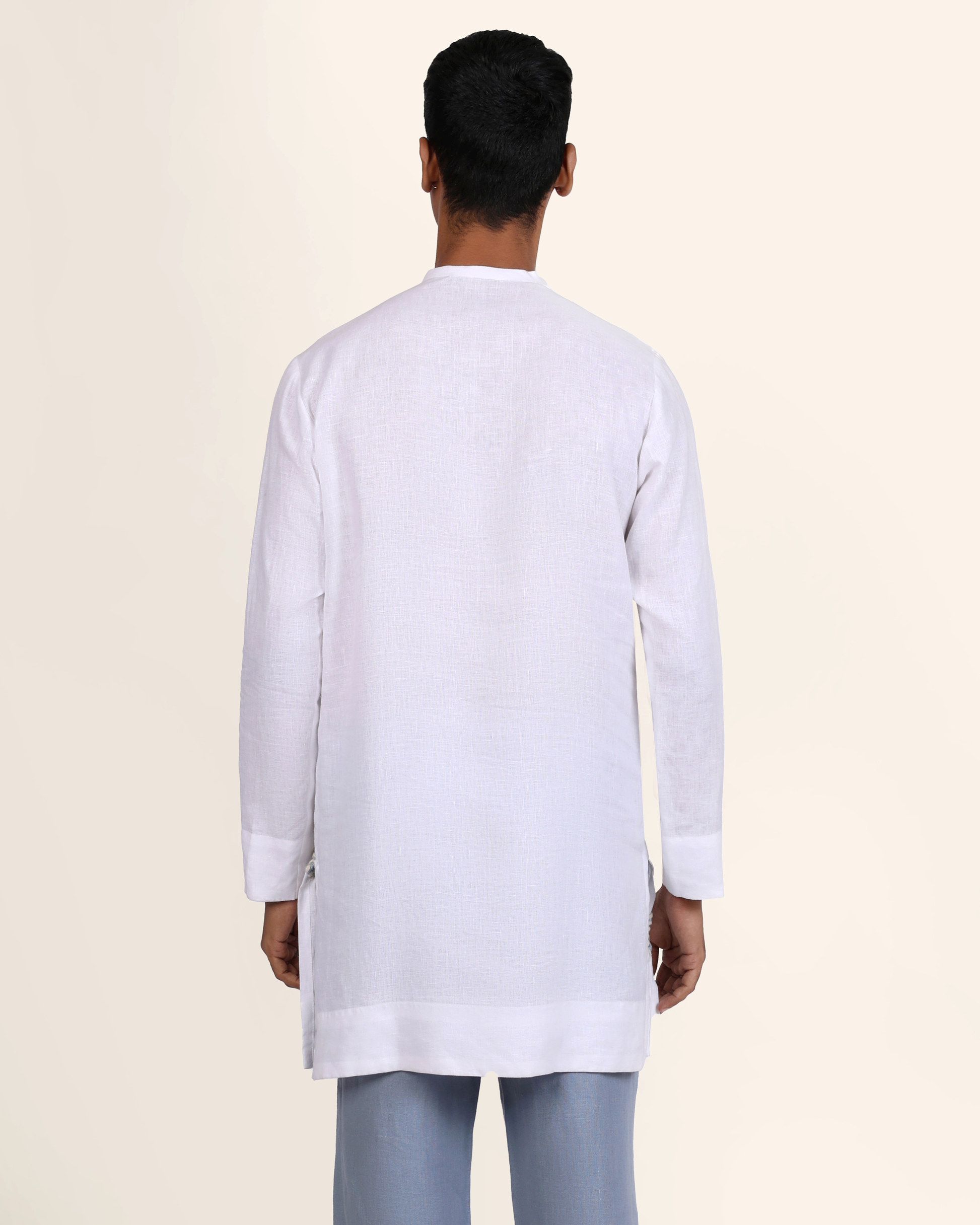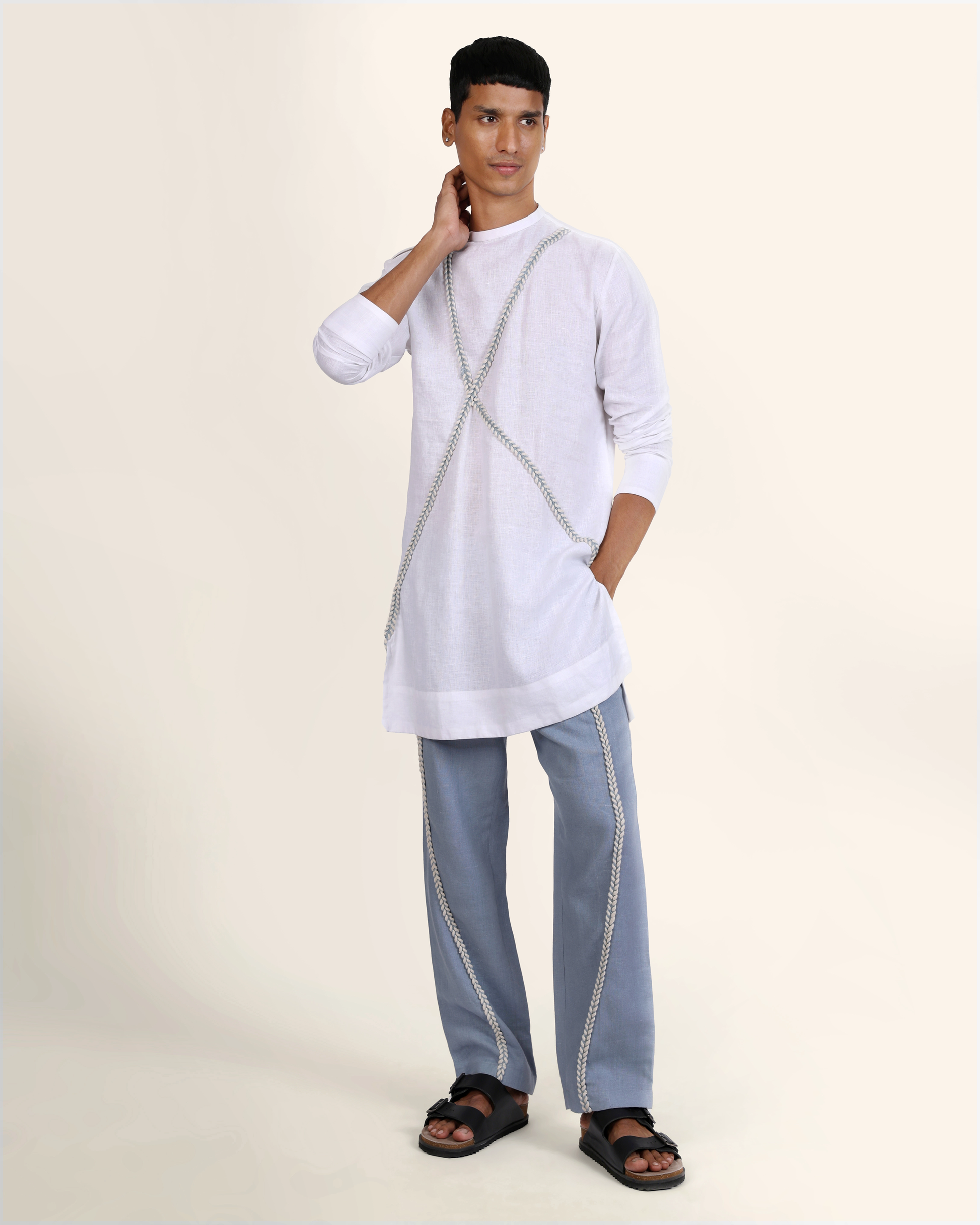 A crisp white kurta in 100% pure linen, accented with elegant embroidered lines. Lightweight, breathable, and made to order, it’s a subtle piece that blends simplicity with artisanal charm, perfect for casual wear or can be layered for special occasions.