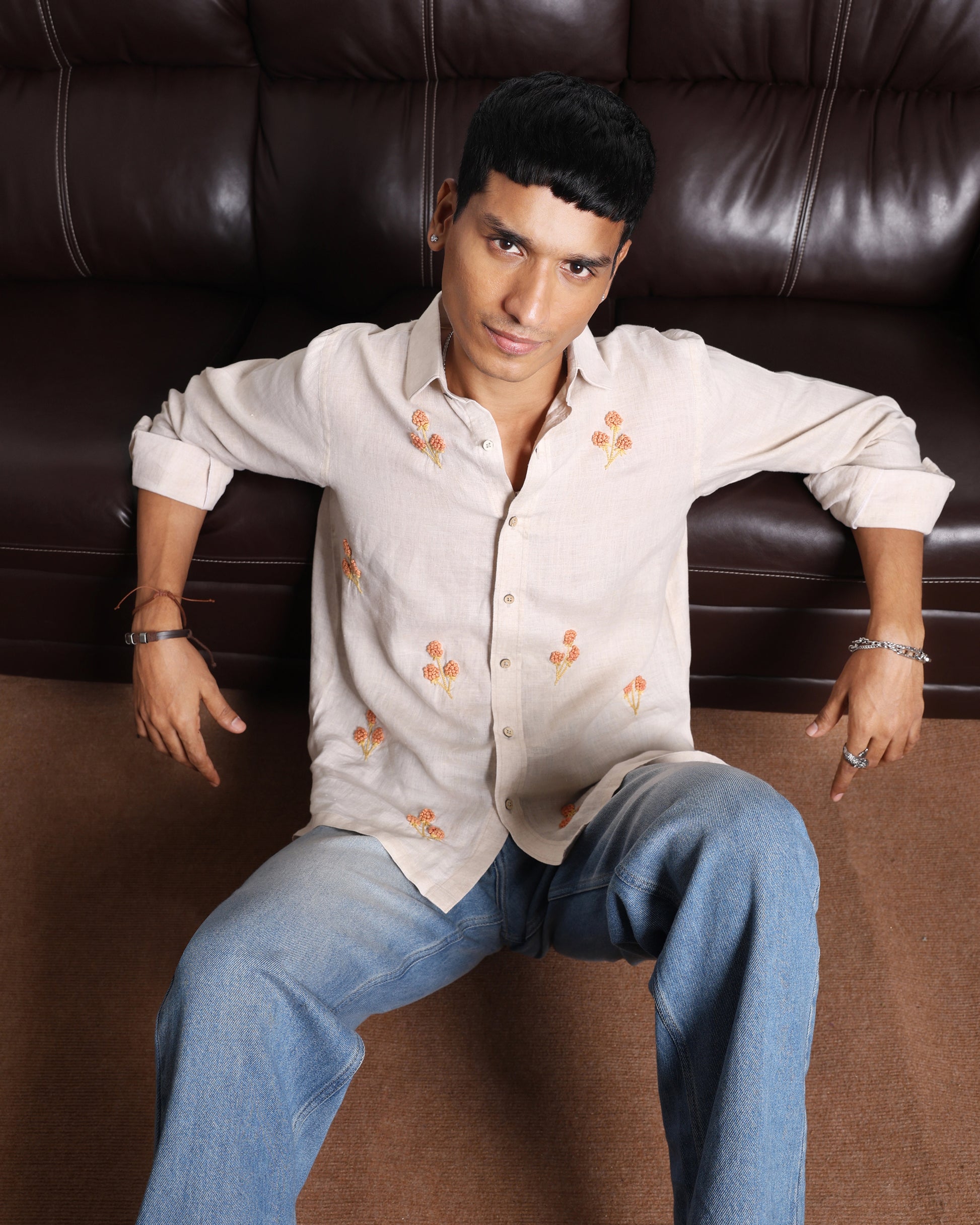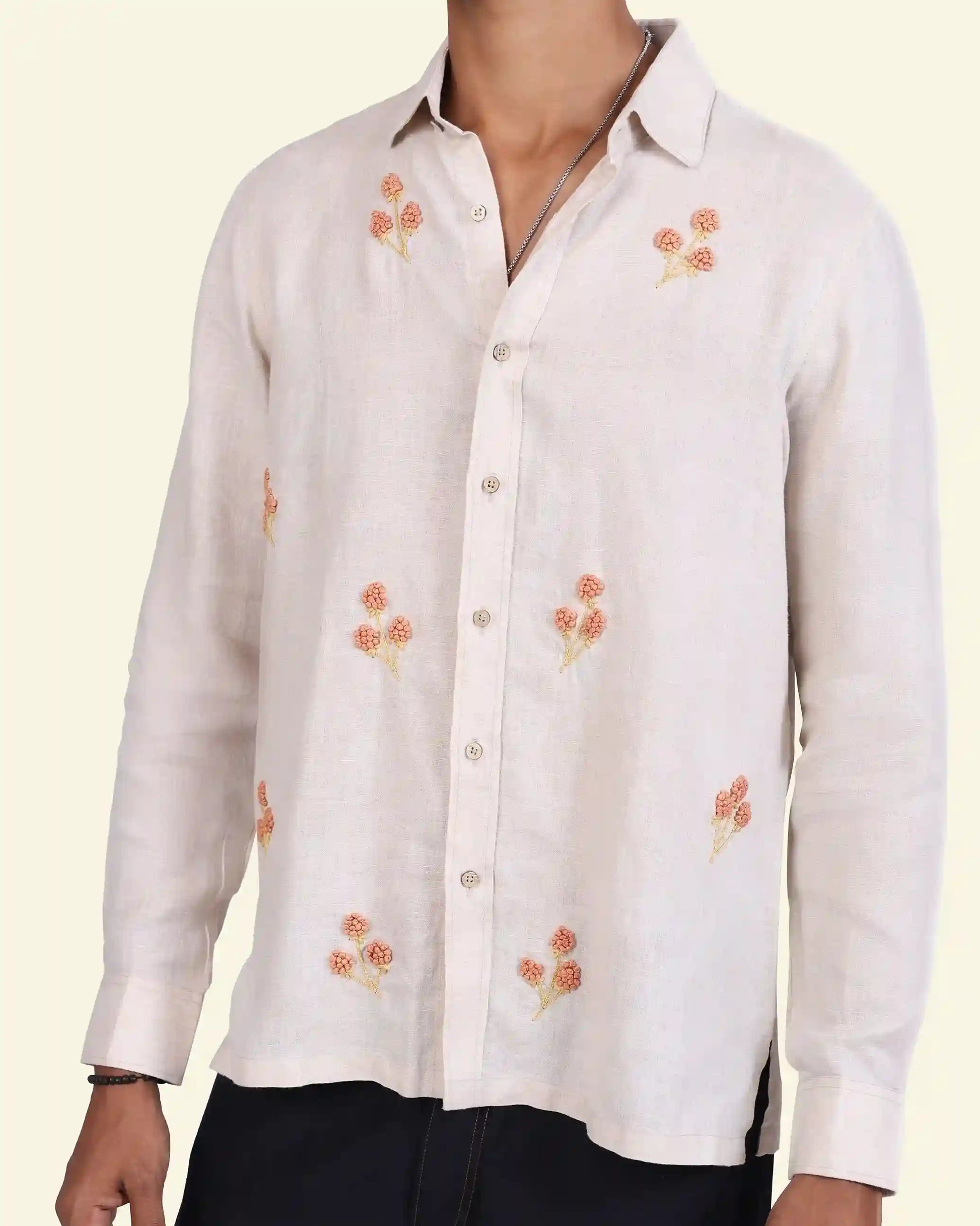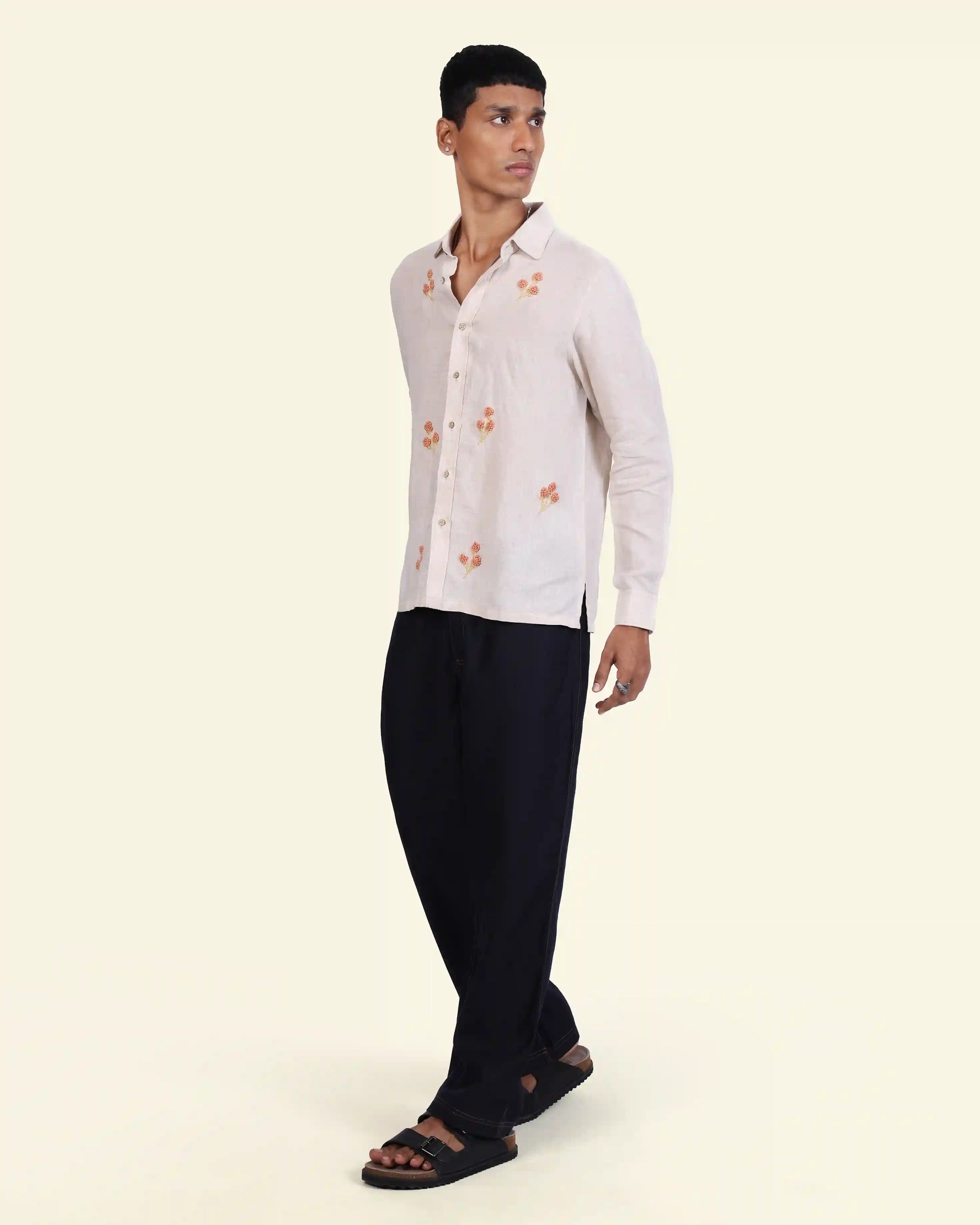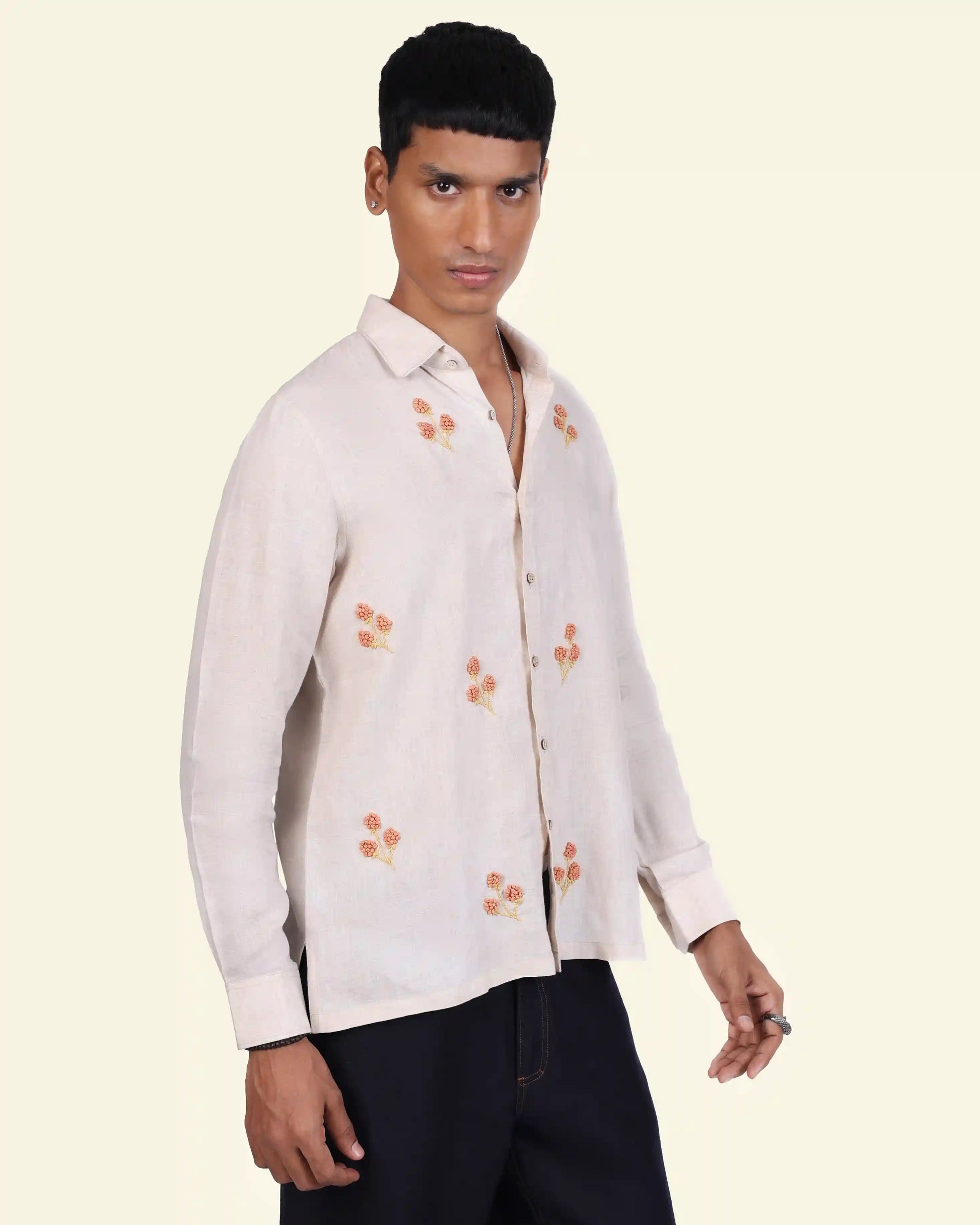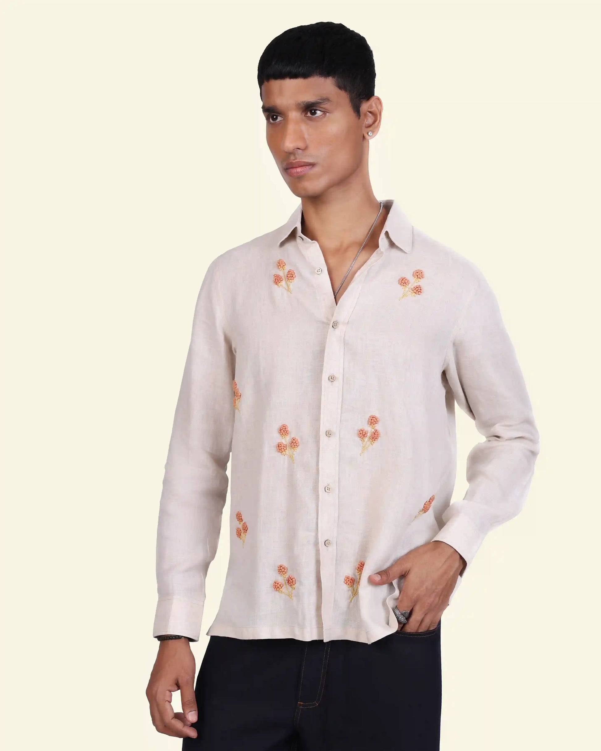Delicate floral embroidery meets airy linen in this easygoing shirt. The neutral base and warm threadwork bring a touch of craft to everyday wear. Made to order in 100% pure linen, it’s your slow-day essential with a hint of charm.