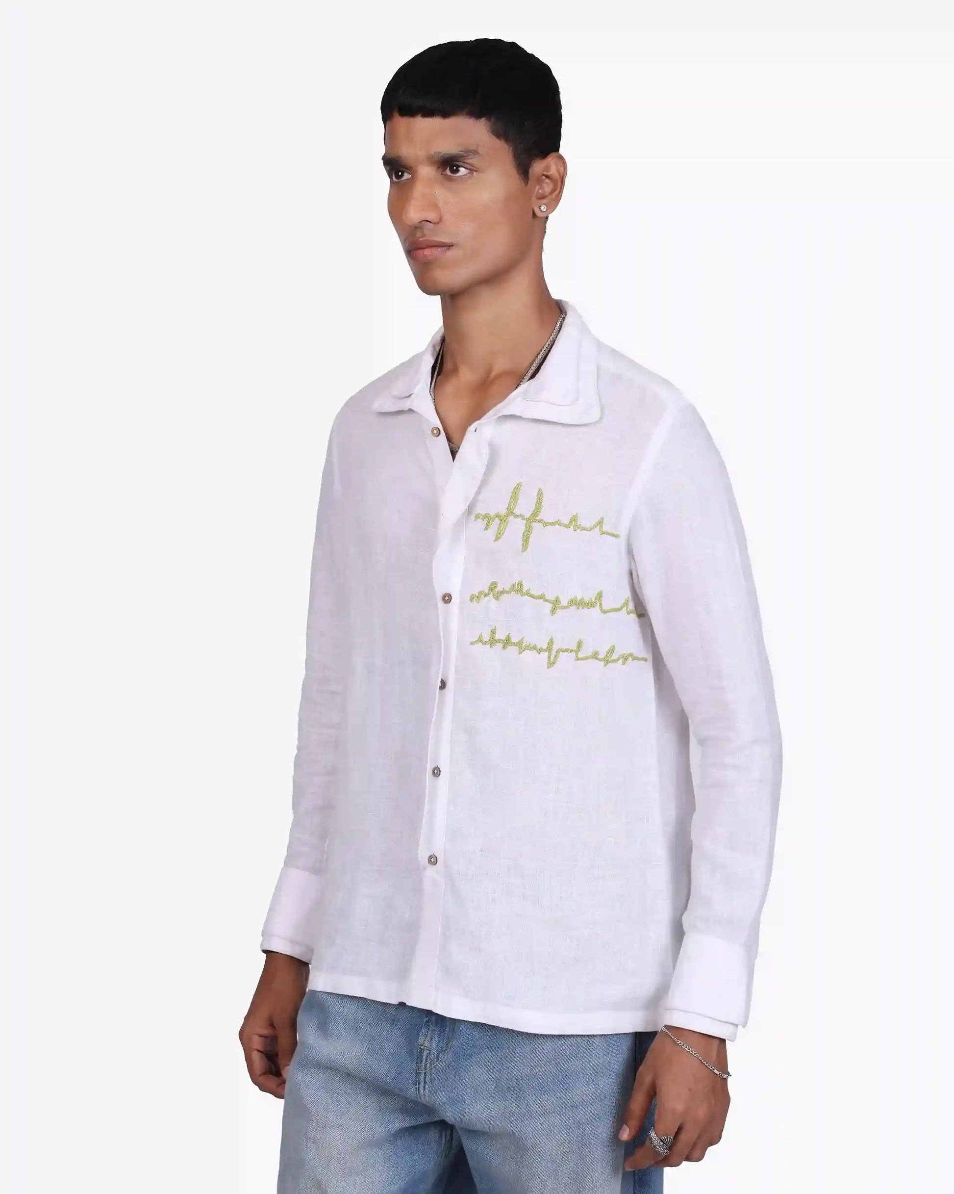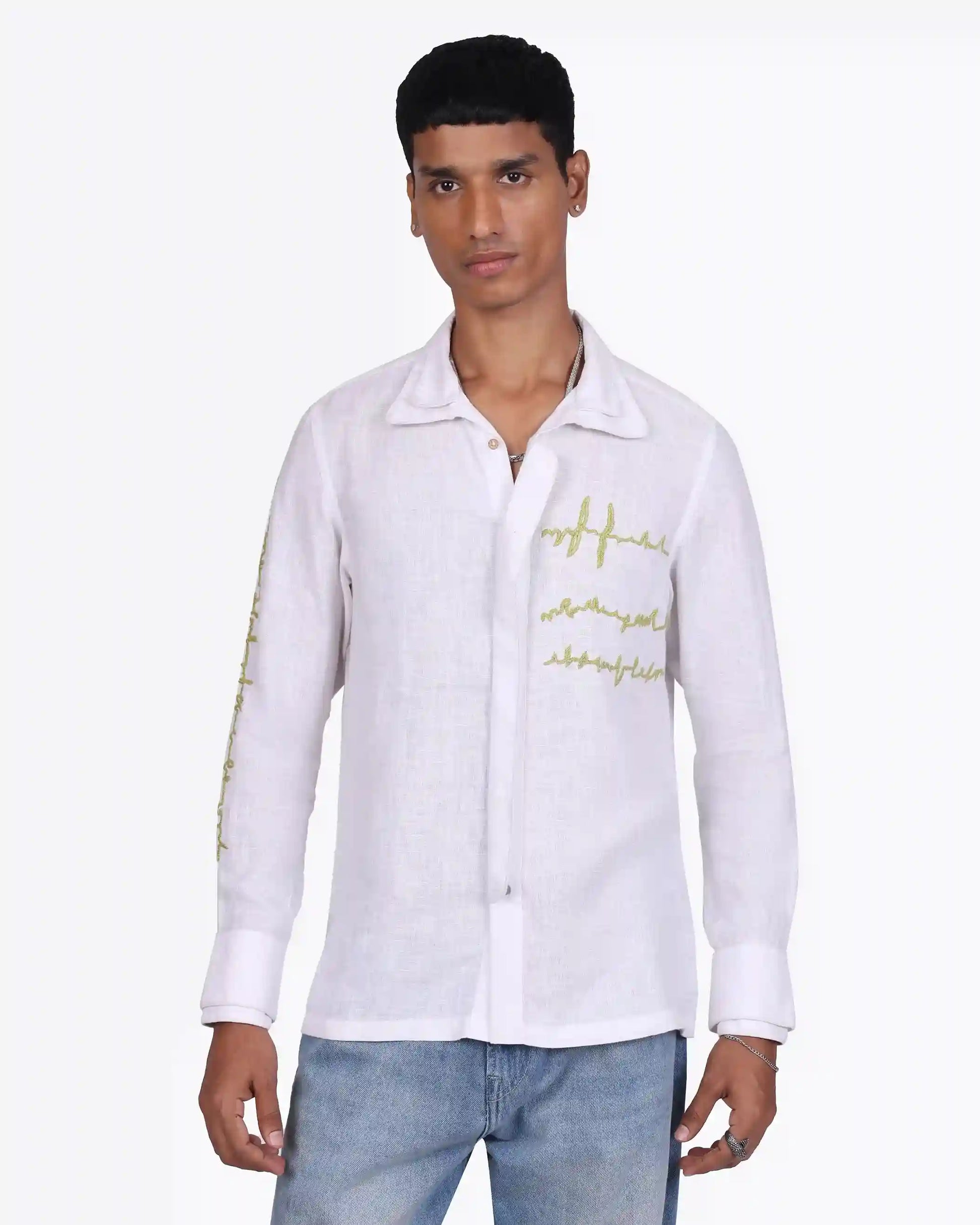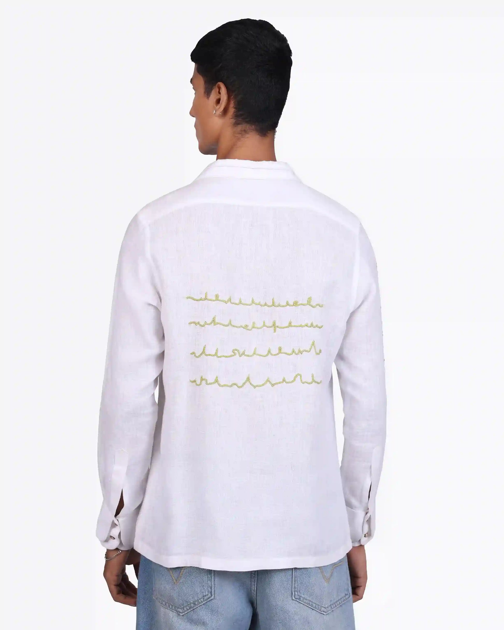 Soft white linen, minimal embroidery, and quiet detail, this shirt speaks in subtle contrasts. Light, breathable, and intentionally designed, it balances craft with clarity. Made to order in 100% pure linen, it’s simplicity that leaves an impression.