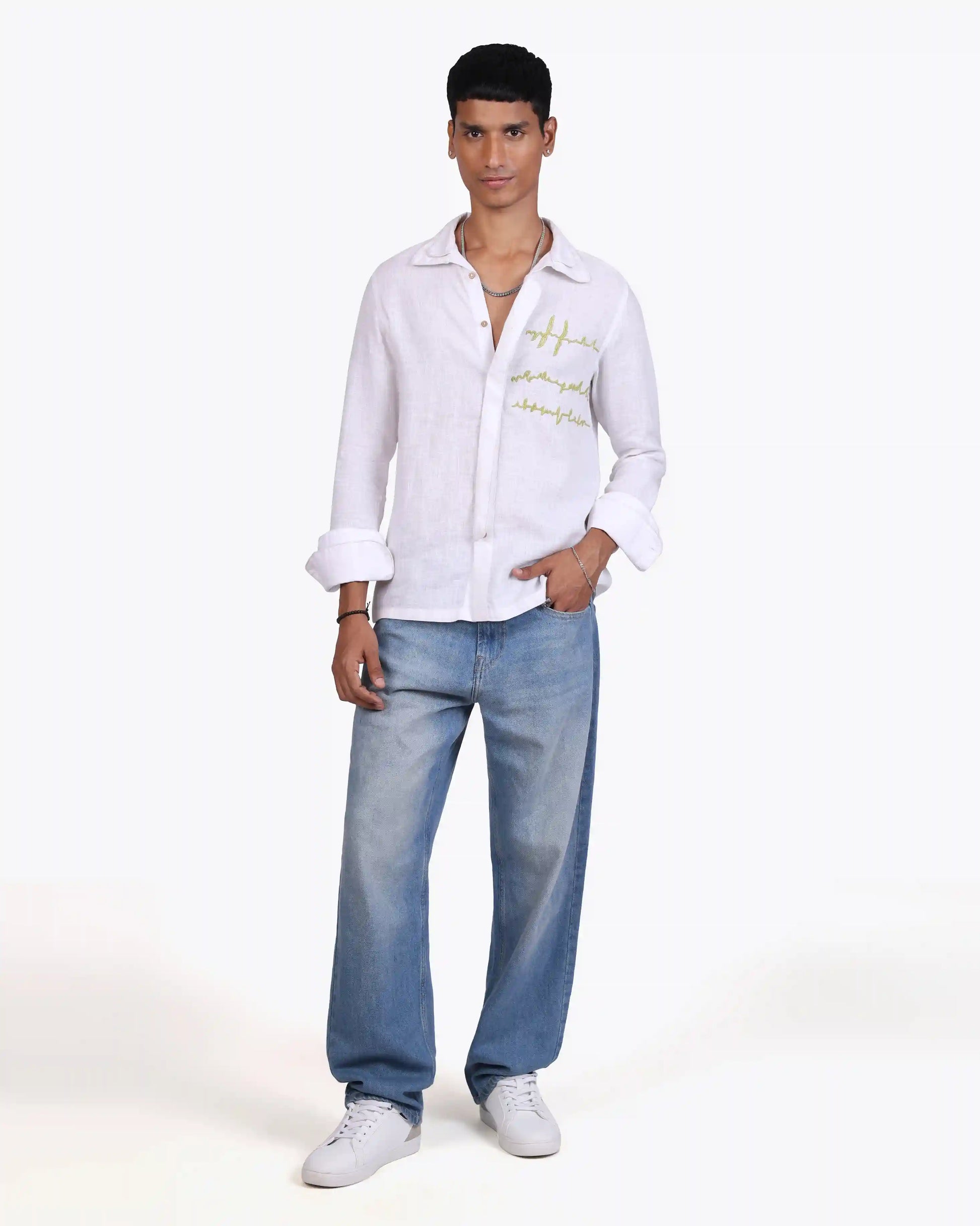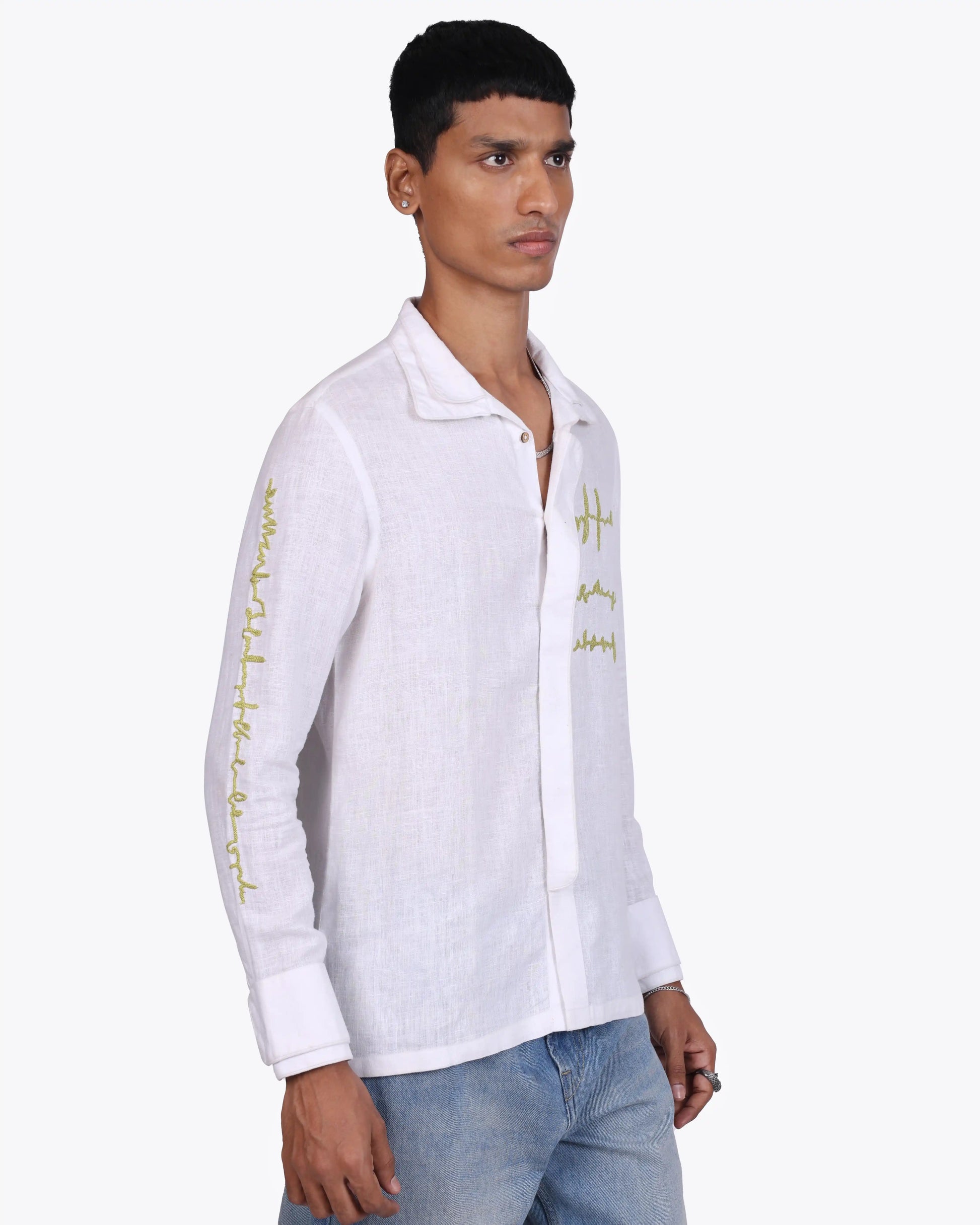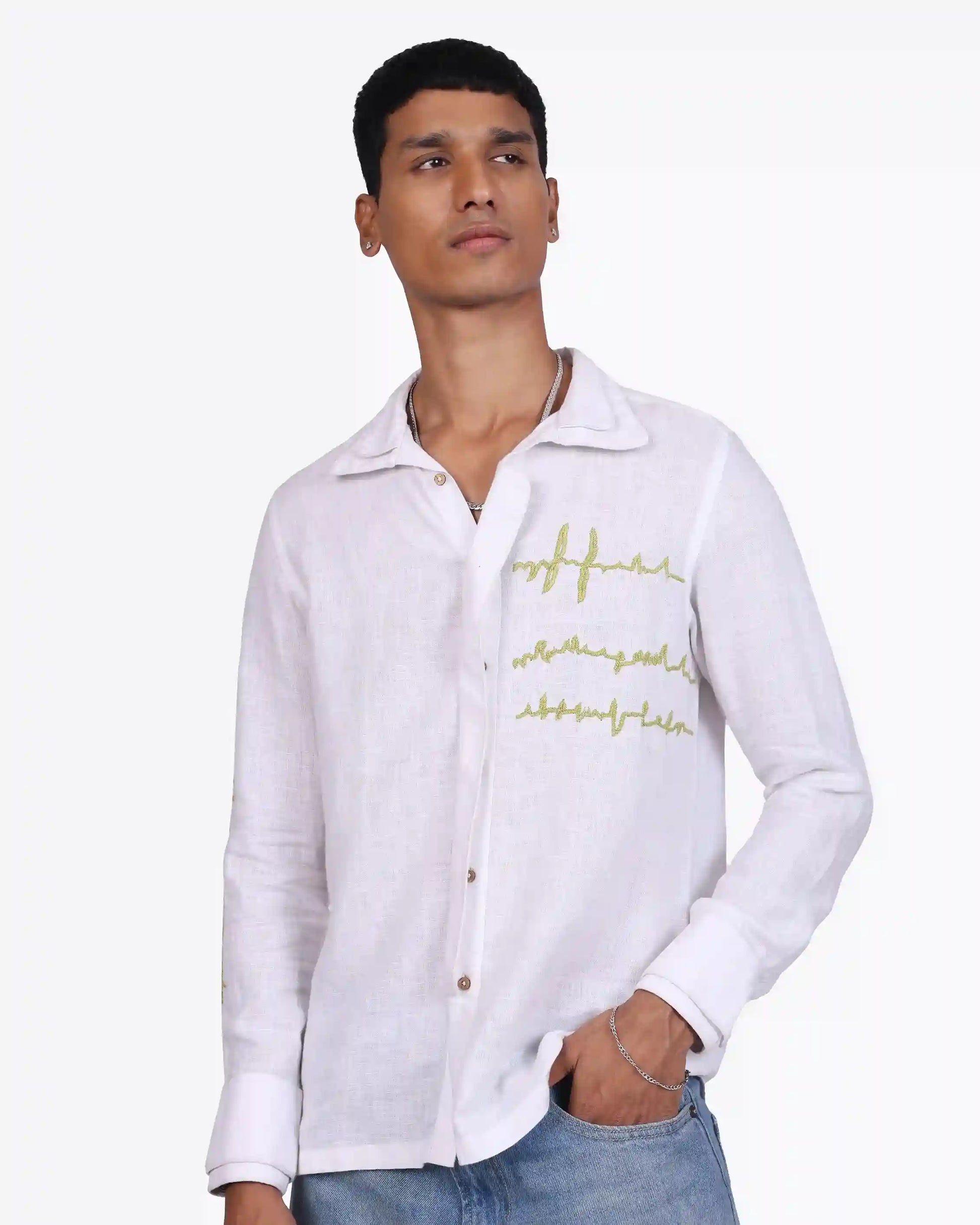 Soft white linen, minimal embroidery, and quiet detail, this shirt speaks in subtle contrasts. Light, breathable, and intentionally designed, it balances craft with clarity. Made to order in 100% pure linen, it’s simplicity that leaves an impression.